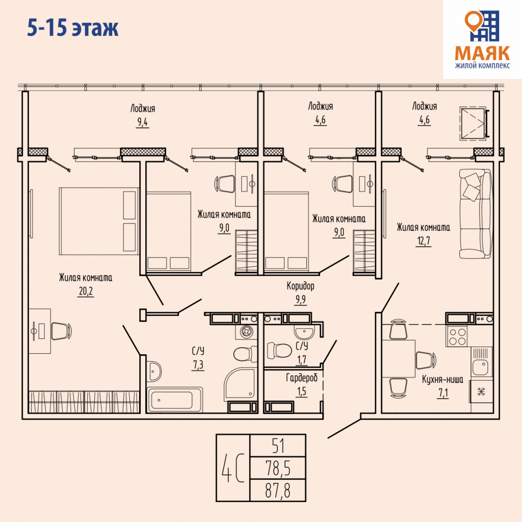 Доступна к покупке 4-комнатная квартира в новом жилом комплексе "Маяк" 🏢. Квартира расположена на 9-м этаже 15-этажного дома. Отличный вариант для семьи.