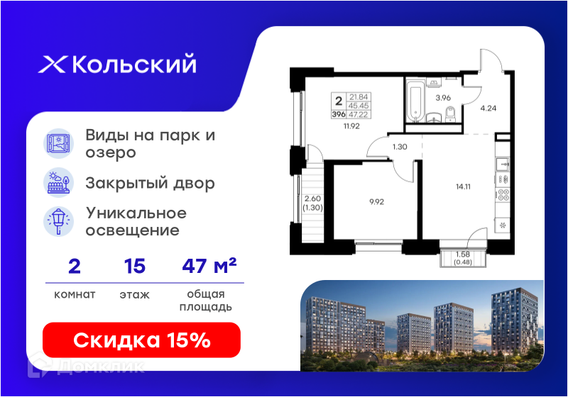 Предлагается 2-комнатная квартира в современном жилом комплексе "Кольский" 🏢. Квартира расположена на 15-м этаже 16-этажного дома. Прекрасный выбор для семьи.